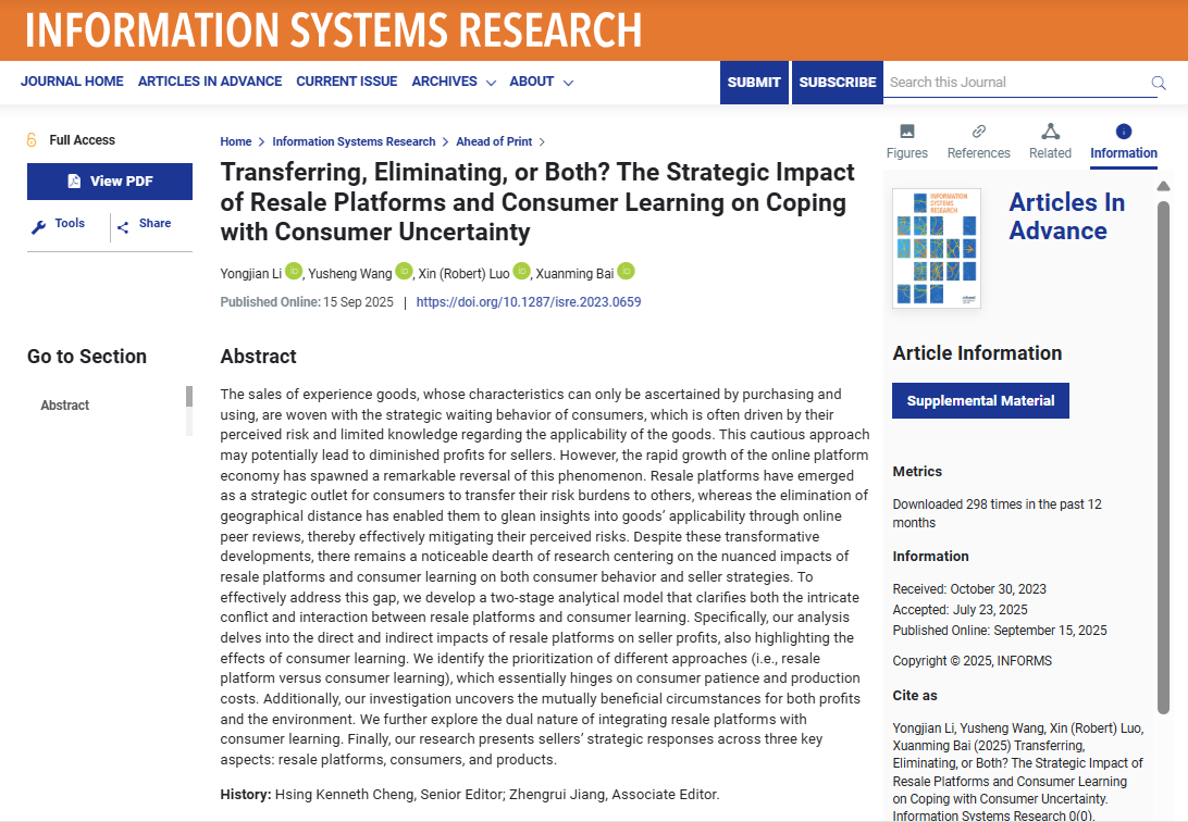近日,伟德国际1946bv李勇建教授和其毕业博士生王昱升、白轩铭,与美国新墨西哥大学安德森管理学院Xin (Robert) Luo合作的论文Transferring, Eliminating, or Both? The Strategic Impact of Resale Platforms and Consumer Learning on Coping with Consumer Uncertainty在信息系统与管理科学交叉领域的国际顶级学术期刊Information Systems Research发表,实现伟德国际1946bv在该期刊零的突破。其中,博士生王昱升2025年毕业后赴香港理工大学物流与航运学系任研究助理教授,博士生白轩铭2021年毕业后在天津大学管理与经济学部任助理教授。本研究聚焦企业对于消费者不确定性的应对策略,并首次剖析转移与消除手段对于企业利润与环境影响的内在影响机制。一直以来,经验商品的特性只能通过购买和使用来确定,其销售与消费者的策略等待行为交织在一起,这种等待行为通常是由消费者感知到的风险和对商品适用性的有限了解驱动的。这种谨慎的做法可能导致卖方的利润减少。然而,网