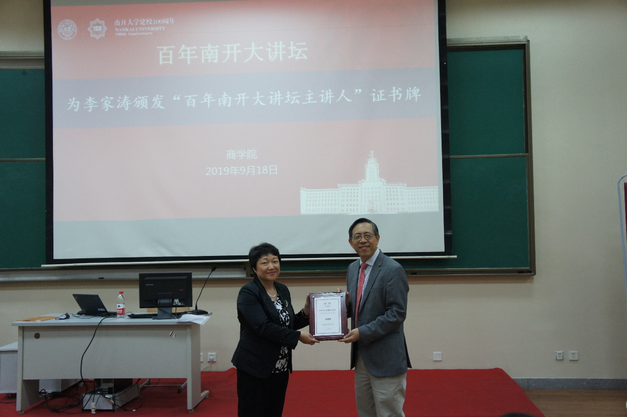 讲座前,伟德国际1946bv副院长李月琳教授致欢迎辞,并为李家涛颁发“百年南开大讲坛主讲人”证书牌。
