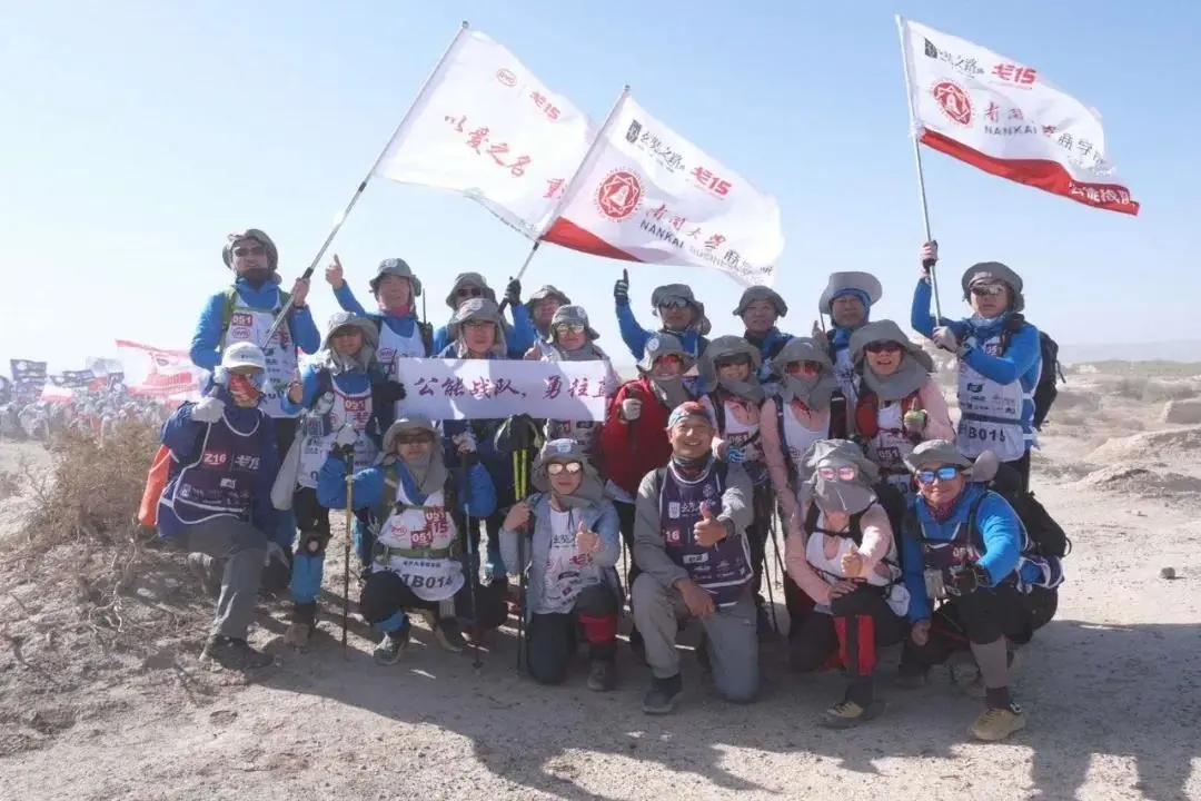 13、欧阳美珍——按照戈赛规则,南开19人战队要想夺得沙克尔顿奖,有且只有一个医疗退赛名额。体验日第一天,有位队友因严重脚伤被迫医疗退赛,后面3天的竞赛日,对于南开战队来说就是背水一战了。最后B队17位勇士克服各种伤痛与困难全员平安完赛,成功获得团队沙克尔顿大奖!感恩所有的鼓励支持、守望相助与隐忍坚持,21位南开师生一步一个脚印,让南开的大旗飘扬在广袤的大漠戈壁,让巍巍南开精神在玄奘之路上得以践行,当南开勇士们手挽手冲向终点的那一刻,当南开校歌在终点庆功宴奏响,作为南开人,满怀骄傲与自豪!