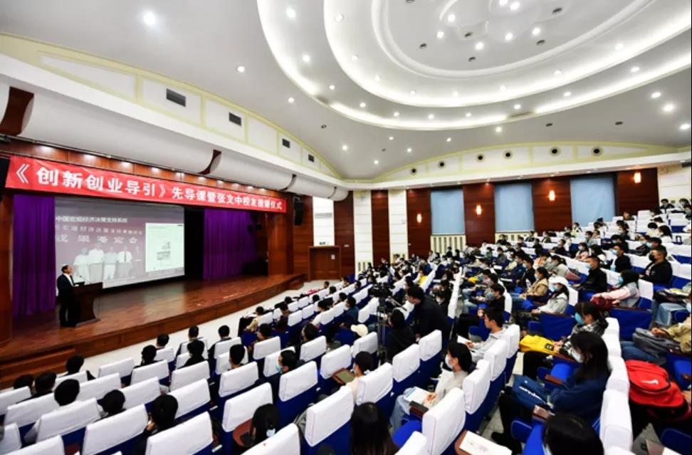 张文中选择将“创业、坎坷、再出发”作为这门先导课的主题,向同学们分享了自己的求学故事、创业故事、人生故事。