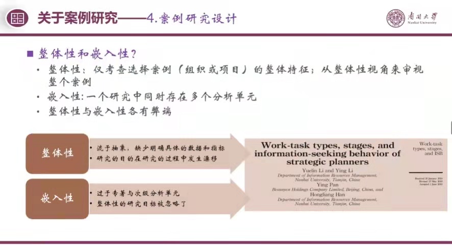 整体性指从整体性视角审视整个案例,考查案例的整体特征;嵌入性指一个研究中同时存在多个分析单元。两种分析方式各有弊端:整体性分析一般缺少明确具体的数据和指标,常流于抽象,且研究目的在研究过程中易发生漂移;嵌入性分析则忽略了整体特征,常常过于专注于次级分析单元,在结果解释时,可能会出现over-estimated的状况。