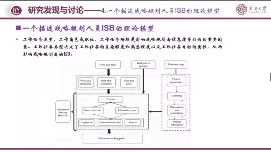 最终,团队基于本研究的结果与发现,将提炼的新要素与已有理论模型(Leckie et al., 1996)相结合,构建了一个描述战略规划人员信息搜寻行为的理论模型。如下图,工作任务类型、工作角色/位置和工作任务阶段影响员工信息搜寻行为,员工采取多种途径、沟通工具和过程搜寻信息(信息源选择、信息类型等),最终实现信息搜寻的目标。