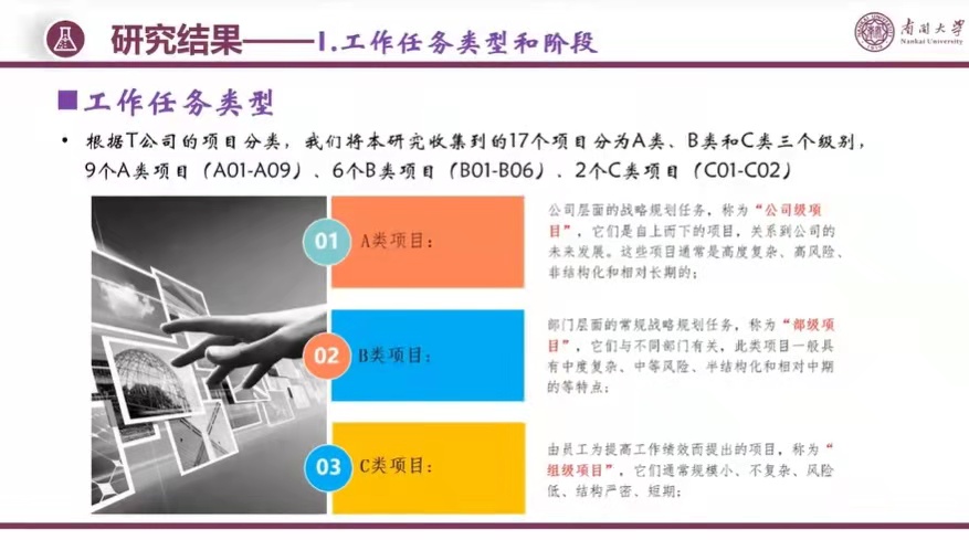 具体地,将数据集中的17个项目分为A类(A01-A09)、B类(B01-B06)和C类(C01-C02)三类,三类工作任务的任务规模、复杂度、风险性、结构性、时间跨度等特征具有明显差异;将工作任务阶段分为项目准备、收集、发现与展示、战略制定四个阶段,特别地,工作任务四个阶段并不是完全的线性过程,而常常是循环往复的过程。