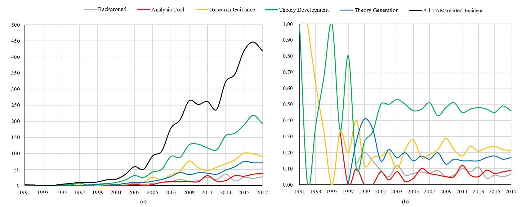 研究通过理论背景、实践分析工具、研究指导、理论发展和理论创新五类与TAM相关的理论事件的挖掘和分析,揭示了理论在研究中所发挥的作用,发现理论发展事件占比远高于其它理论事件。