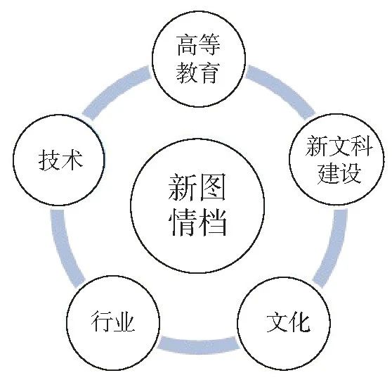 从学科发展视角看,与自然科学和技术科学一样,人文社会科学相互交叉渗透越来越多、越普遍,已经成为学科建设与发展的重要特征。正是因为学科交叉的发展,需要打破传统的文科专业与学科孤立建设与发展的现象。新文科起源于把新技术融入哲学、文学、语言等诸如此类的课程中,为学生提供综合性的跨学科学习,特别是针对传统文科进行学科重组,强调文理交叉。新文科建设不能脱离“四新”中的另“三新”,不能脱离今天的科研大环境,包括数据密集型科研、多学科交叉与科研合作。基于此,新图情档是与相关学科共荣的融合式教育,既包括加强图书馆学、情报学、档案学等学科之间的交叉融合,也包括图情档一级学科与管理科学、计算机科学、法学、语言文学、历史学等其他一级学科之间的交叉融合,在交叉融合中体现图情档学科贡献度,强化专业生命力和影响力,全面提升图情档的学科地位。