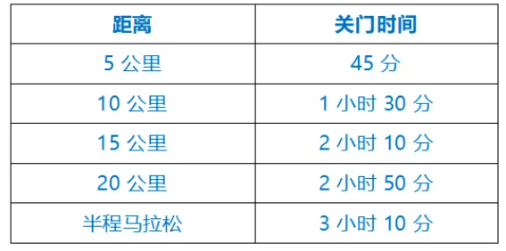 3.为了保证参赛选手赛事安全,比赛路线将按公里点位置设置分段关门时间。关门时间按自然时间计算,关门时间到后,相应公里点的计时毯停止工作,相应路段将恢复社会交通。未跑到相应公里点的选手须退出赛道,以免发生危险。退出赛道的选手搭乘收容车到终点取衣。