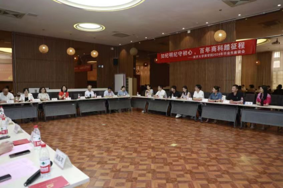 (通讯员潘麒羽)6月19日,“知纪明纪守初心,百年商科踏征程”伟德国际1946bv党纪学习教育暨欢送2024届毕业生座谈会在学院A301会议室举办。学院党委书记王坚,副院长张继勋、田莉、李凯,党委副书记兼副院长周翠翠,学院校友办主任程成及毕业班辅导员出席,本硕博毕业生代表16人参加。会议由学院学生工作办公室主任潘麒羽主持。