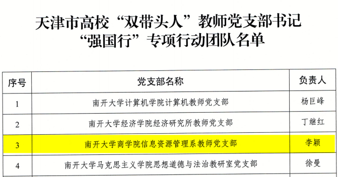 (通讯员:姜忆楠 王媛媛)日前,中共天津市委教育工作委员会公布天津市高校“双带头人”教师党支部书记“强国行”专项行动团队名单,学院信息资源管理系教师党支部成功入选。
