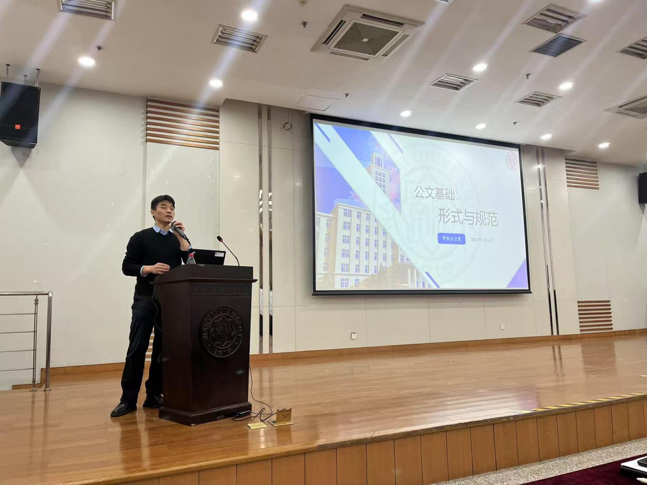 为落实学院党委关于进一步加强安全教育与安全培训的有关要求,保障学院教学科研及日常运行秩序,结合学院“一公多能”培训主题要求,2025年1月10日,学院邀请学校办公室马腾老师来院向行政人员讲解“公文基础:形式与规范”。