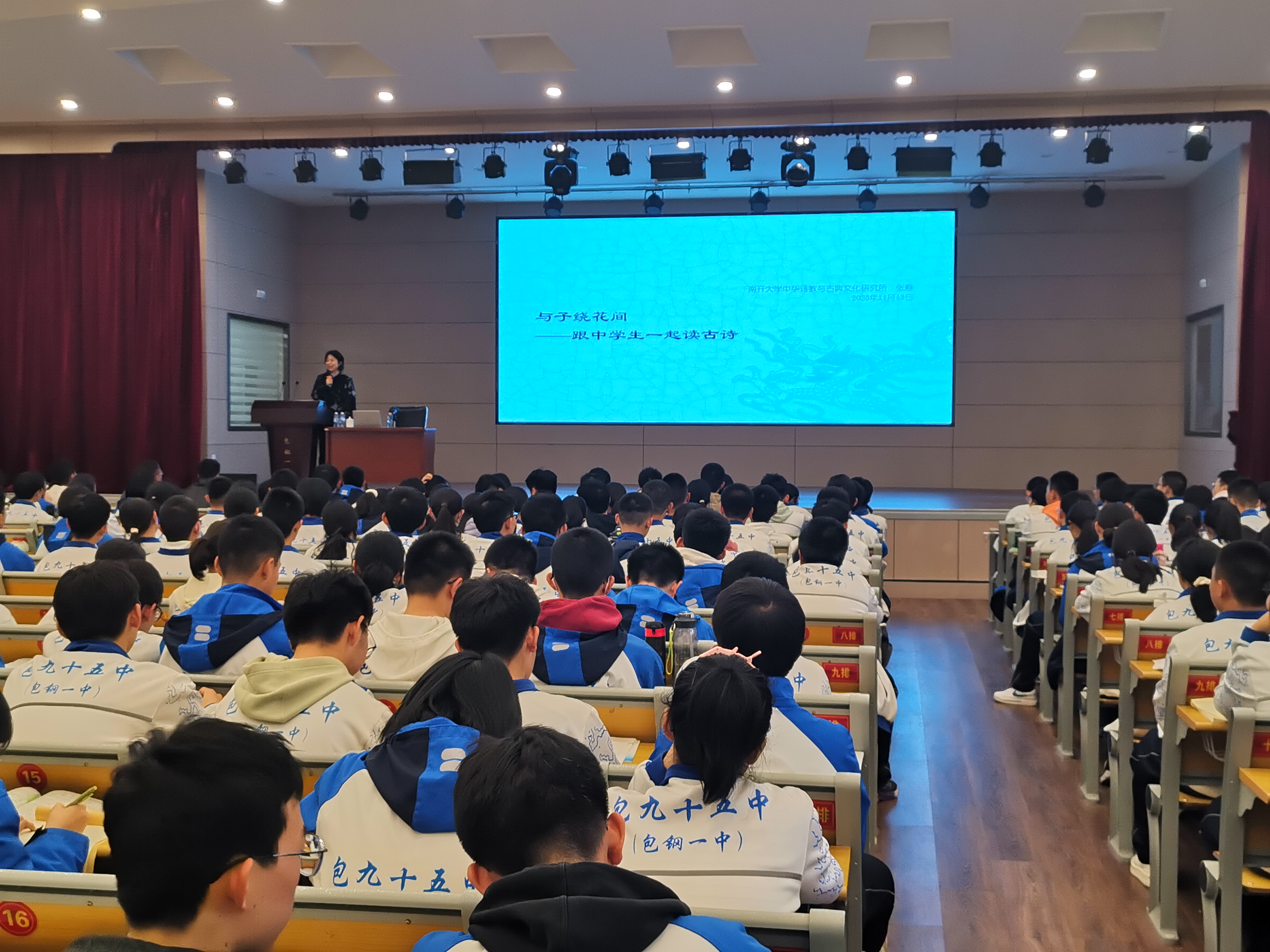 (通讯员张玉川)为传承中华优秀传统文化,厚植学生人文素养,持续扩大伟德victor1946影响力,近日,伟德国际1946bv晋蒙招生工作组特邀文学院古典文学专家张静教授赴内蒙古包头市第九十五中学开展题为《与子绕花间——跟中学生一起读古诗》的讲座。包头市第九十五中学常务副校长段世平,副校长刘星、刘宪瑞,教研室主任刘志福,教务处副主任孙宝婧与高一、高二年级学生及部分教师齐聚报告厅,共赴一场浸润心灵的诗词之约。