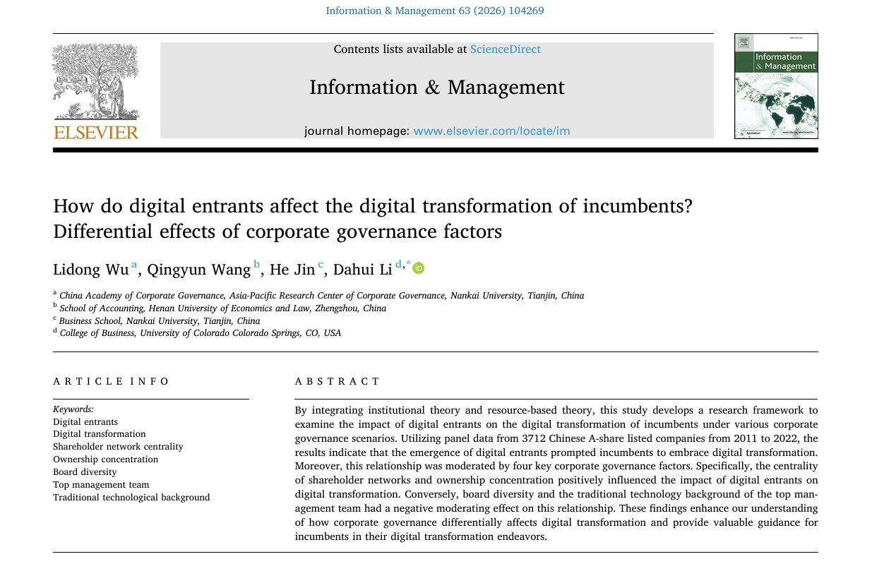 伟德国际1946bv武立东教授团队与河南财经政法大学会计学院王晴云讲师、伟德国际1946bv晋禾博士生、美国科罗拉多斯普林斯大学李大辉教授合作的论文“How do digital entrants affect the digital transformation of incumbents? Differential effects of corporate governance factors”在信息系统与信息资源管理领域国际权威期刊Information & Management在线发表。