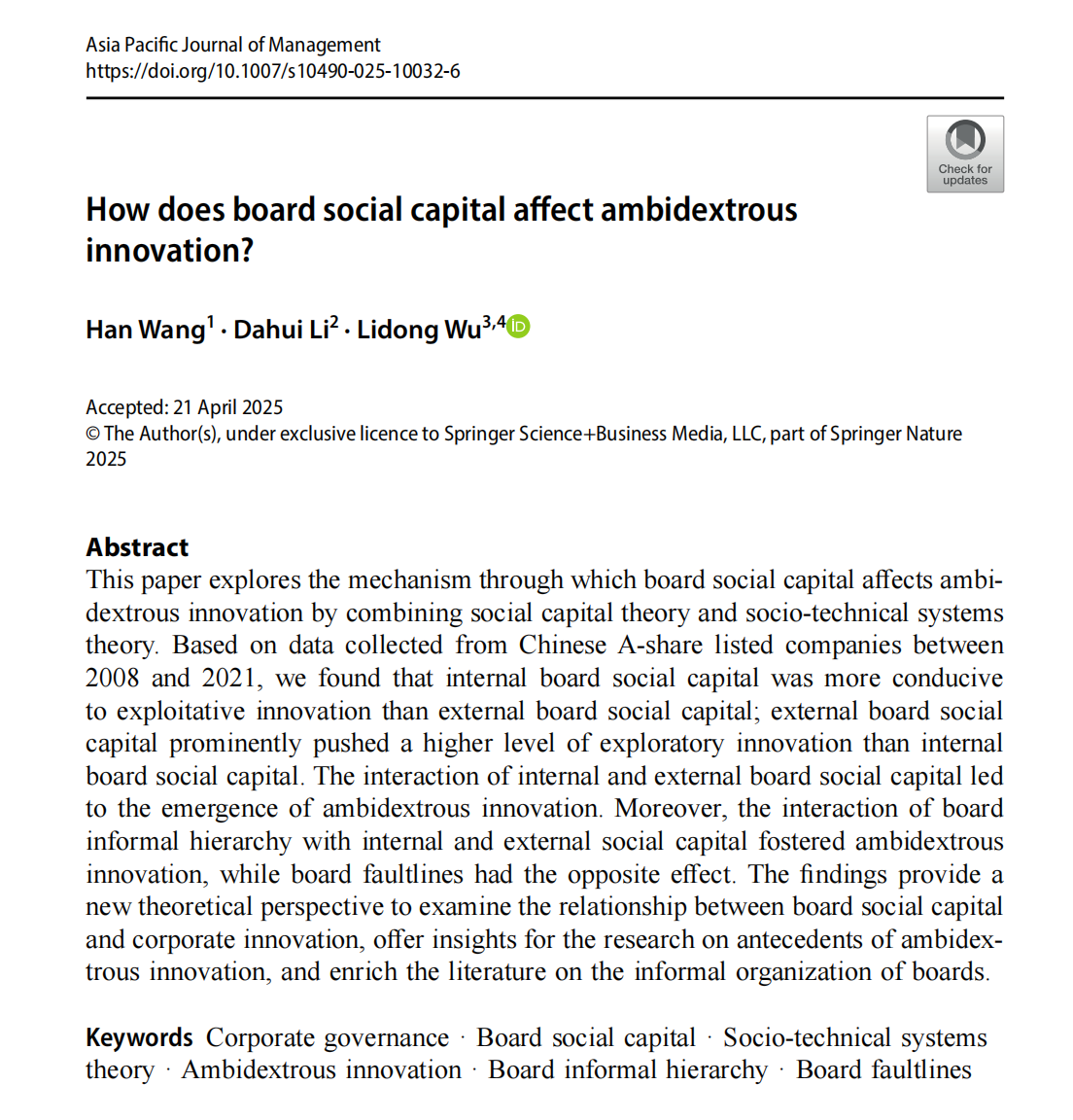 伟德国际1946bv武立东教授团队与内蒙古财经大学工商管理学院王晗讲师、美国科罗拉多斯普林斯大学李大辉教授合作的论文“How does board social capital affect ambidextrous innovation?”在管理学领域国际权威期刊Asia Pacific Journal of Management在线发表。